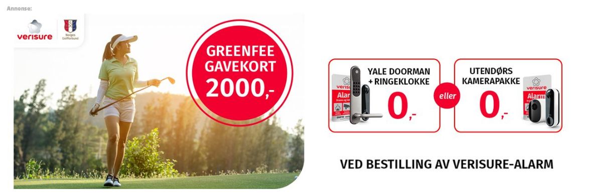 Verisure er Norges ledende alarmselskap og tilbyr deg som medlem i en golfklubb tilsluttet NGF en gratis sikkerhetsbefaring, hvor brann- og innbruddsikkerheten i ditt hjem blir gjennomgått. Ved bestilling av boligalarm kan du velge enten Yale Doorman dørlås + Arlo videoringeklokke til 0, eller utendørskamerapakke til 0, samt et Greenfee gavekort til en verdi av 2000 (gyldig ut 2025). Gavekortet kan brukes på alle Norges golfklubber!